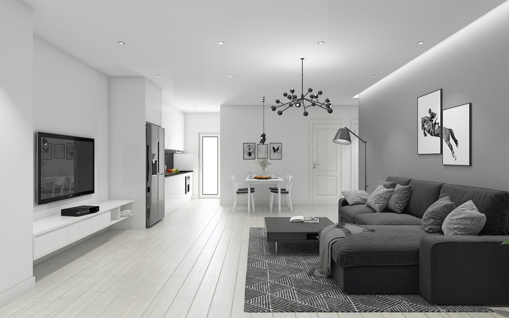 Tường trắng không chỉ là xu hướng cho không gian sạch sẽ, sáng sủa mà còn là một mẹo của nhà thiết kế để làm cho căn phòng có cảm giác rộng mở hơn. Bằng cách kết hợp màu sơn trắng bóng bẩy với màu sắc tự nhiên trong đồ nội thất, căn hộ sẽ có cảm giác rộng hơn mà không làm mất đi sự ấm áp của tông màu trầm. Khi chọn màu sắc, hãy chọn các bảng màu trung tính như xám, gỗ để giữ các điểm nhấn trong tổng thể không gian