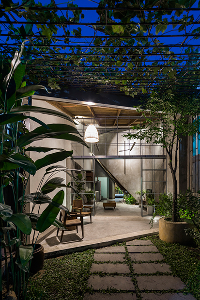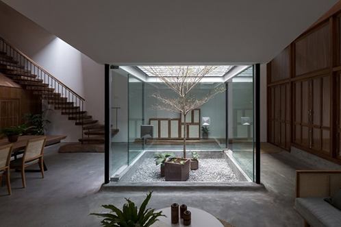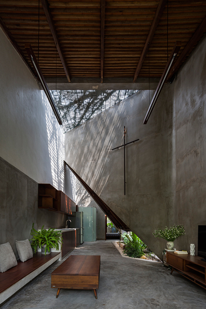 Phá cách trong công trình của kiến trúc sư Đào Hưng và Sỹ Tuấn là một không gian mái hình phễu và khu vườn nhỏ giữa nhà. Độ mở của mái vừa đủ tạo ra một nguồn sáng chính cho không gian phòng khách.