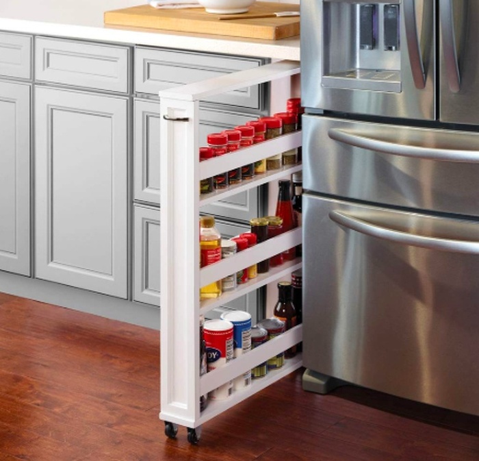 Nghe thì có vẻ lạ kỳ nhưng những chiếc tủ này với thiết kế độc đáo, chiếm diện tích rất nhỏ trong gian phòng bếp. Bạn có thể để đầy đủ các vật dụng nhà bếp, lấy đồ dễ dàng và không cồng kềnh, rối mắt.