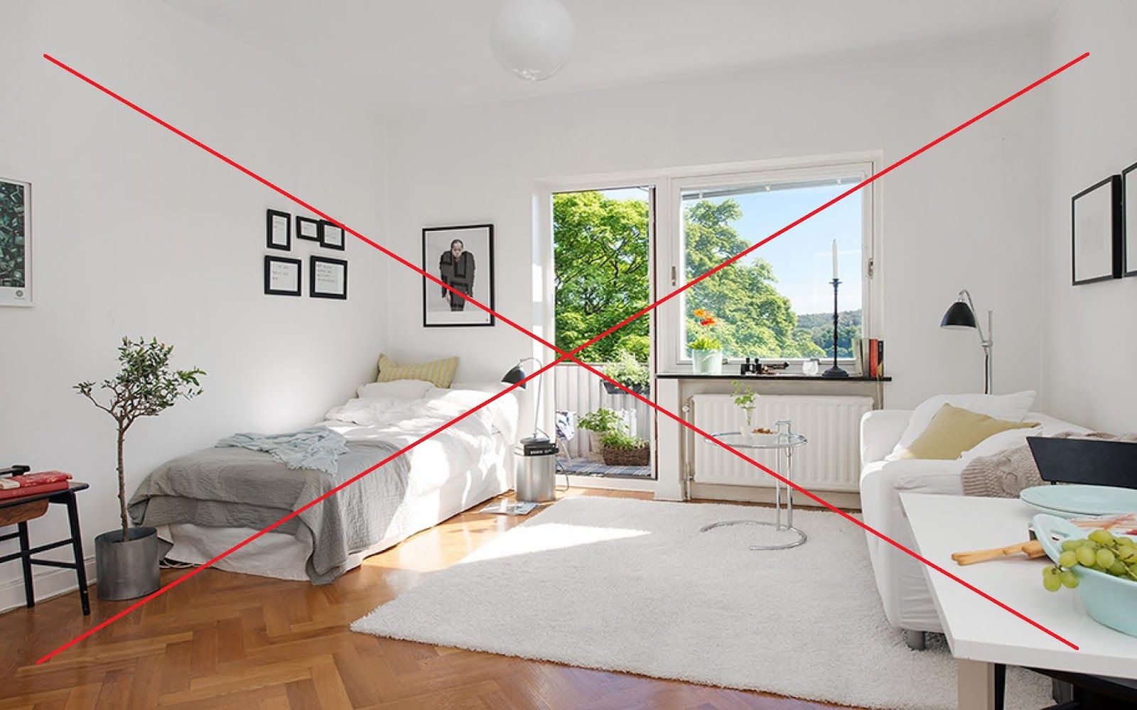 • Cửa chính đối diện giường ngủ, không có không gian riêng tư.