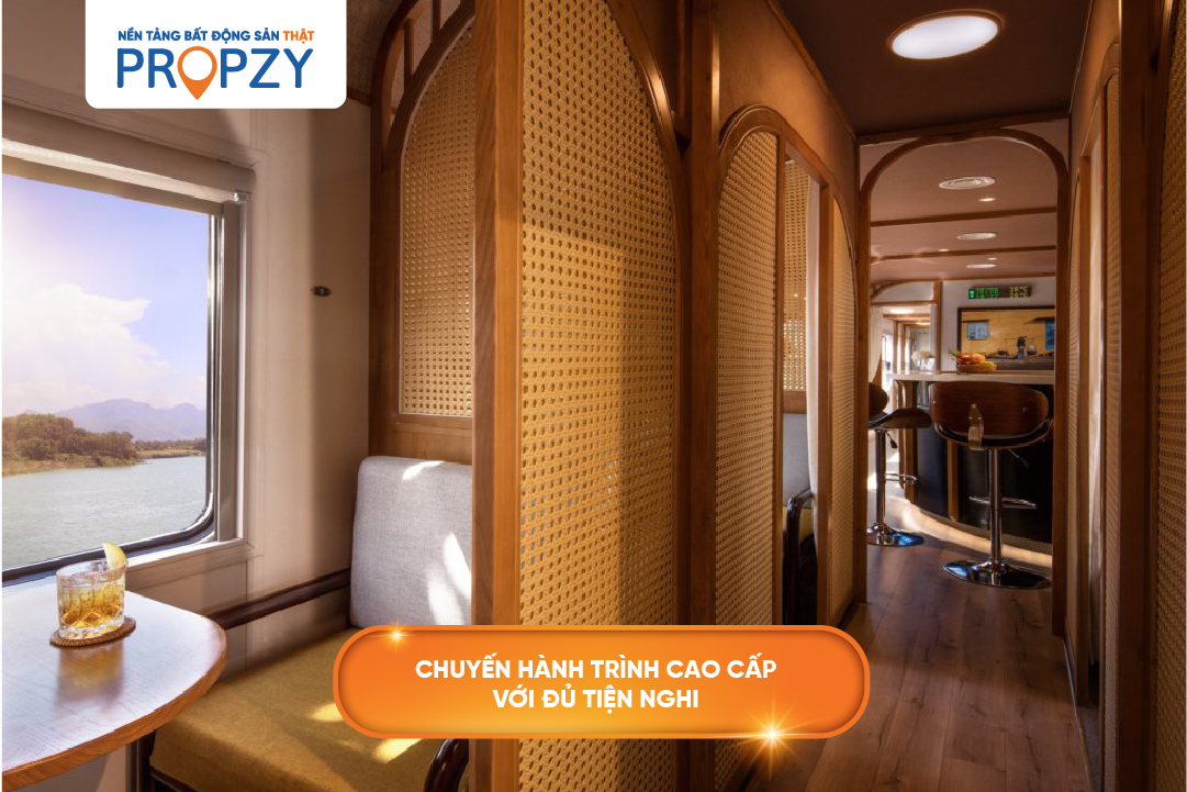 Một không gian sang trọng, hiện đại được thiết kế riêng cho không gian tàu hỏa 5 sao, khác hẳn với tàu hỏa bình thường khác. Các ghế ngồi/ giường nằm được thiết kế với chất liệu êm ái, sạch sẽ, sàn được lót vải sang trọng chống ồn, và còn được tích hợp thêm một số tiện ích cho Khách hàng như cổng sạc USB, wifi, tivi giải trí,… thậm chí còn có cả nút bấm gọi nhân viên phục vụ trên tàu, nhằm mang đến sự thoải mái nhất cho Khách hàng trong suốt quá trình di chuyển.