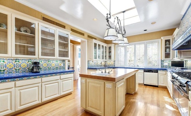 Nhà bếp rộng lớn, thông thoáng, được trang hoàng với sàn gỗ cứng, gạch ốp tường cầu kỳ, và nhiều trang thiết bị nấu nướng hiện đại, cao cấp.