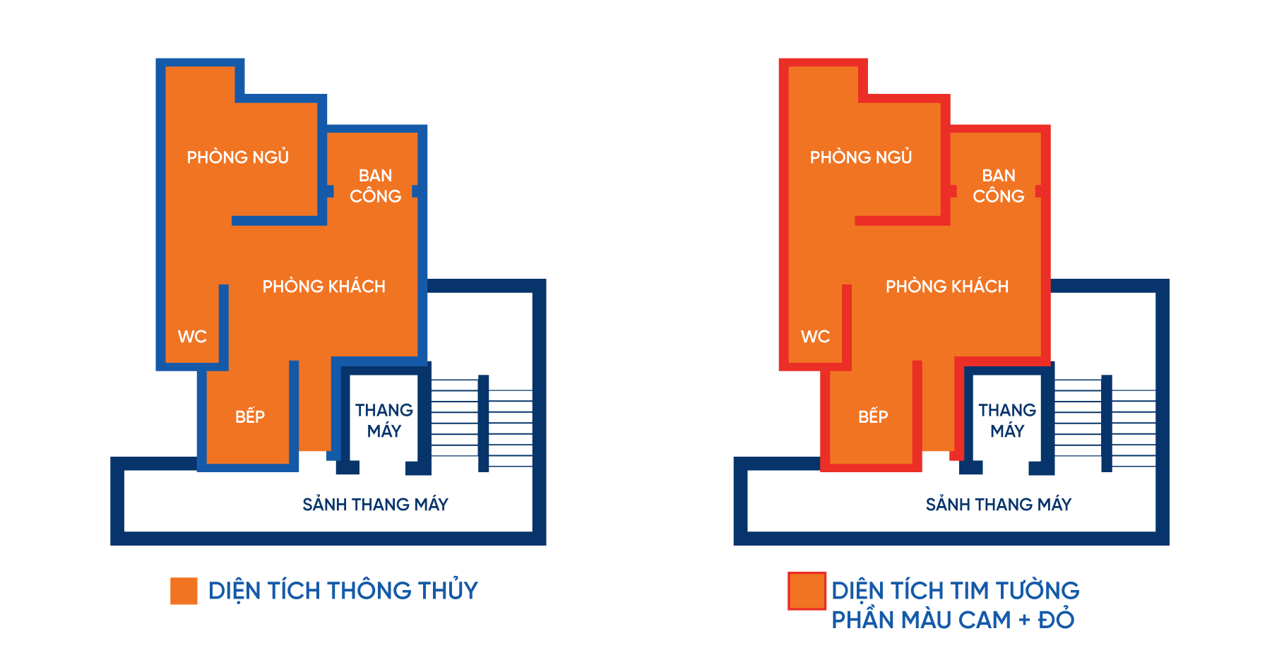 - Trong ảnh trên, phần đánh dấu màu cam là diện tích thông thủy. Diện tích thông thủy theo quy định tại Việt Nam bao gồm phần màu cam + phần tường ngăn giữa các phòng bên trong căn hộ.