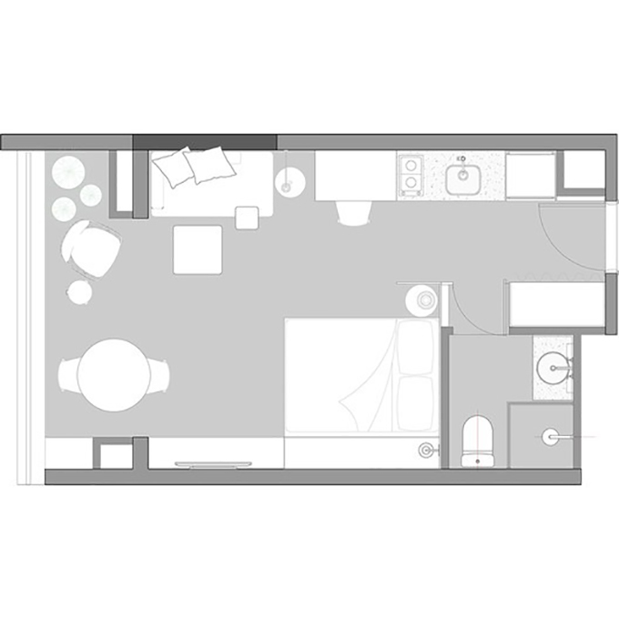 Diện tích siêu nhỏ nhưng căn hộ vẫn có đủ chỗ ngủ, bếp ăn, nơi tiếp khách, phòng vệ sinh khép kín.