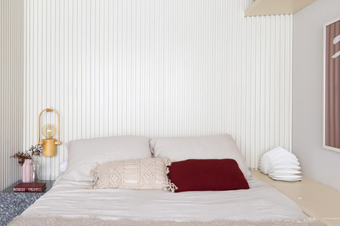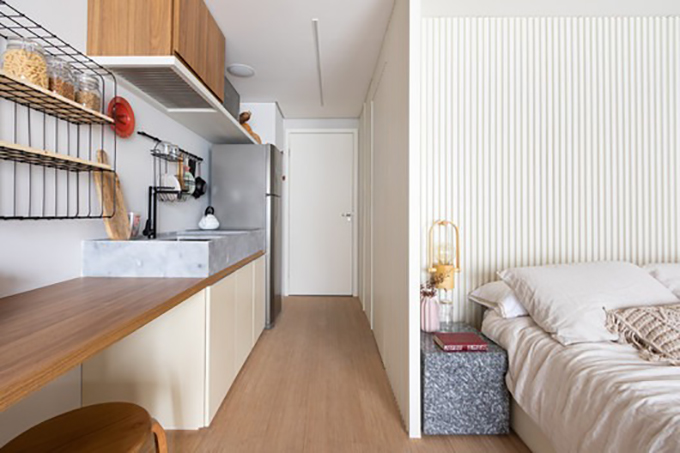 Để tạo ra hai phòng tách biệt, giường được đặt ở một góc của căn hộ.