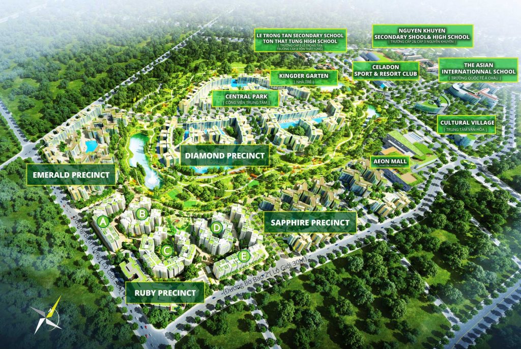 Celadon có quy mô lên đến 82ha với hơn 16ha là khu công viên cây xanh sinh thái, trường học quốc tế , khu liên hiệp thể dục thể thao và trung tâm thương mại giải trí quốc tế…