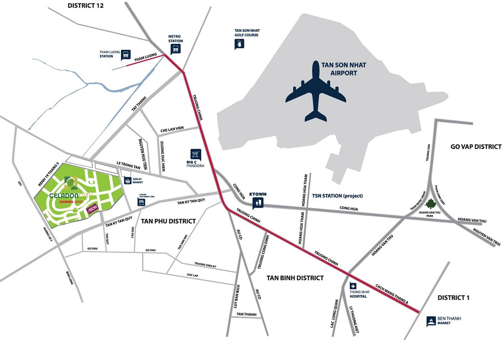 Từ dự án căn hộ Celadon City bạn dễ dàng di chuyển đến các khu vực quận huyện lân cận, các khu vực chức năng quan trọng qua các con đường Lê Trọng Tấn, Tân Kỳ Tân Quý, Cộng Hòa, Trường Trinh,… Cụ thể: