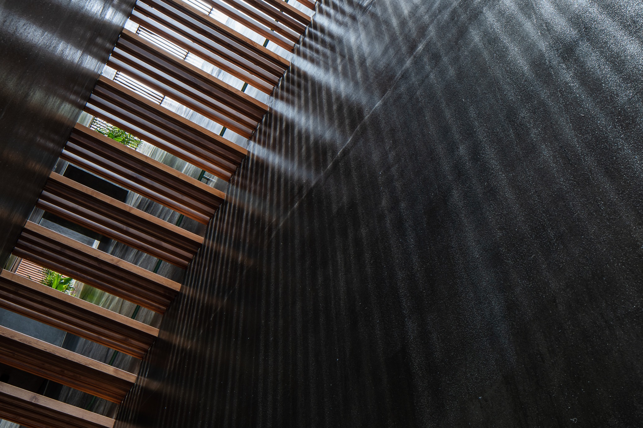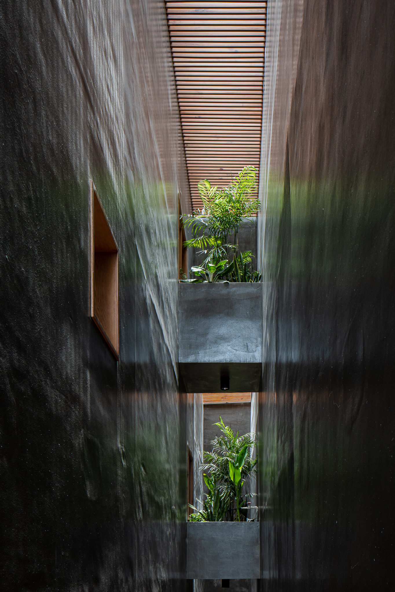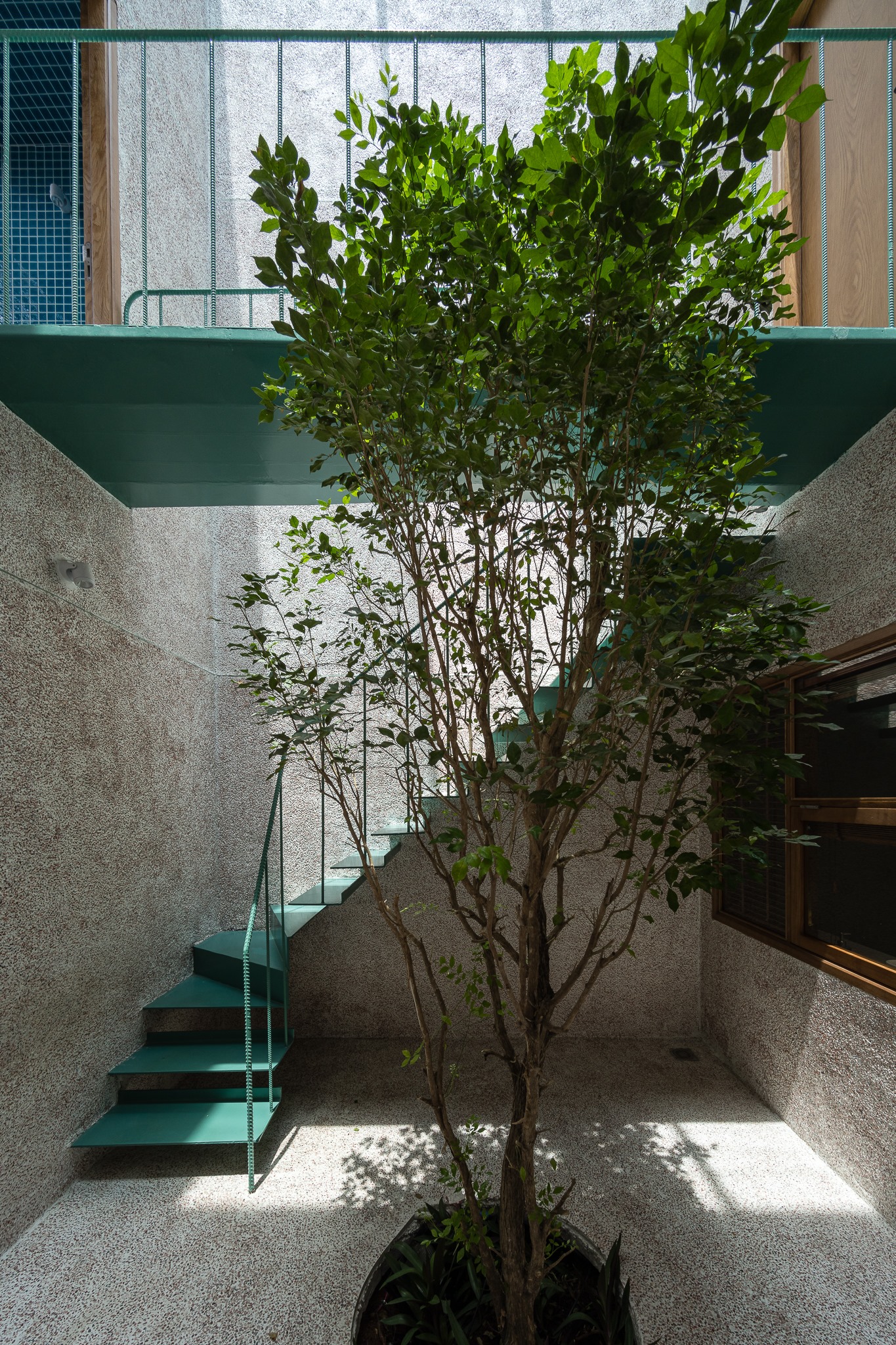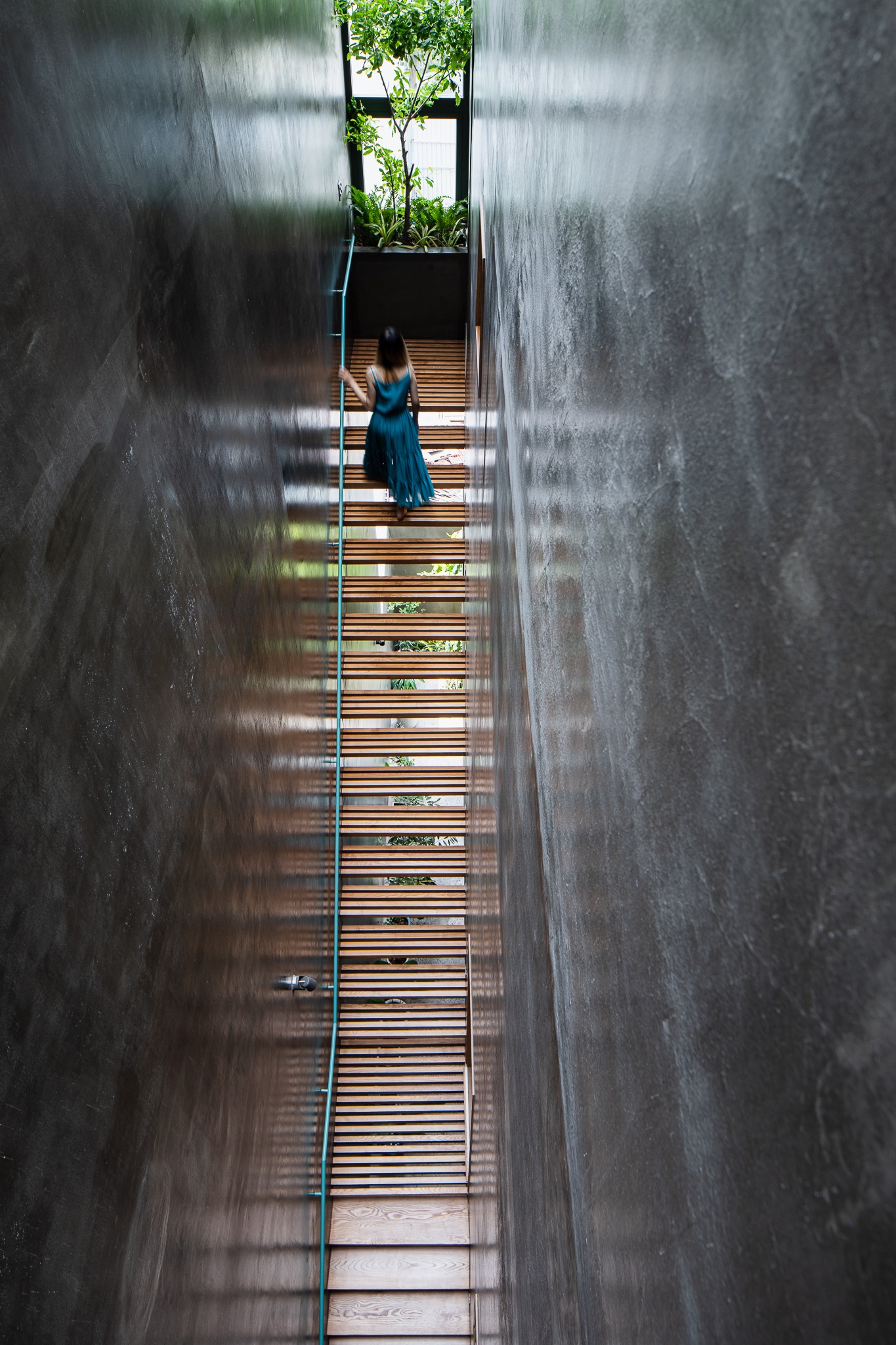 Những khe hở của bậc thang tạo khoảng trống để có thể nhìn xuống khu vườn bên dưới tầng trệt.
