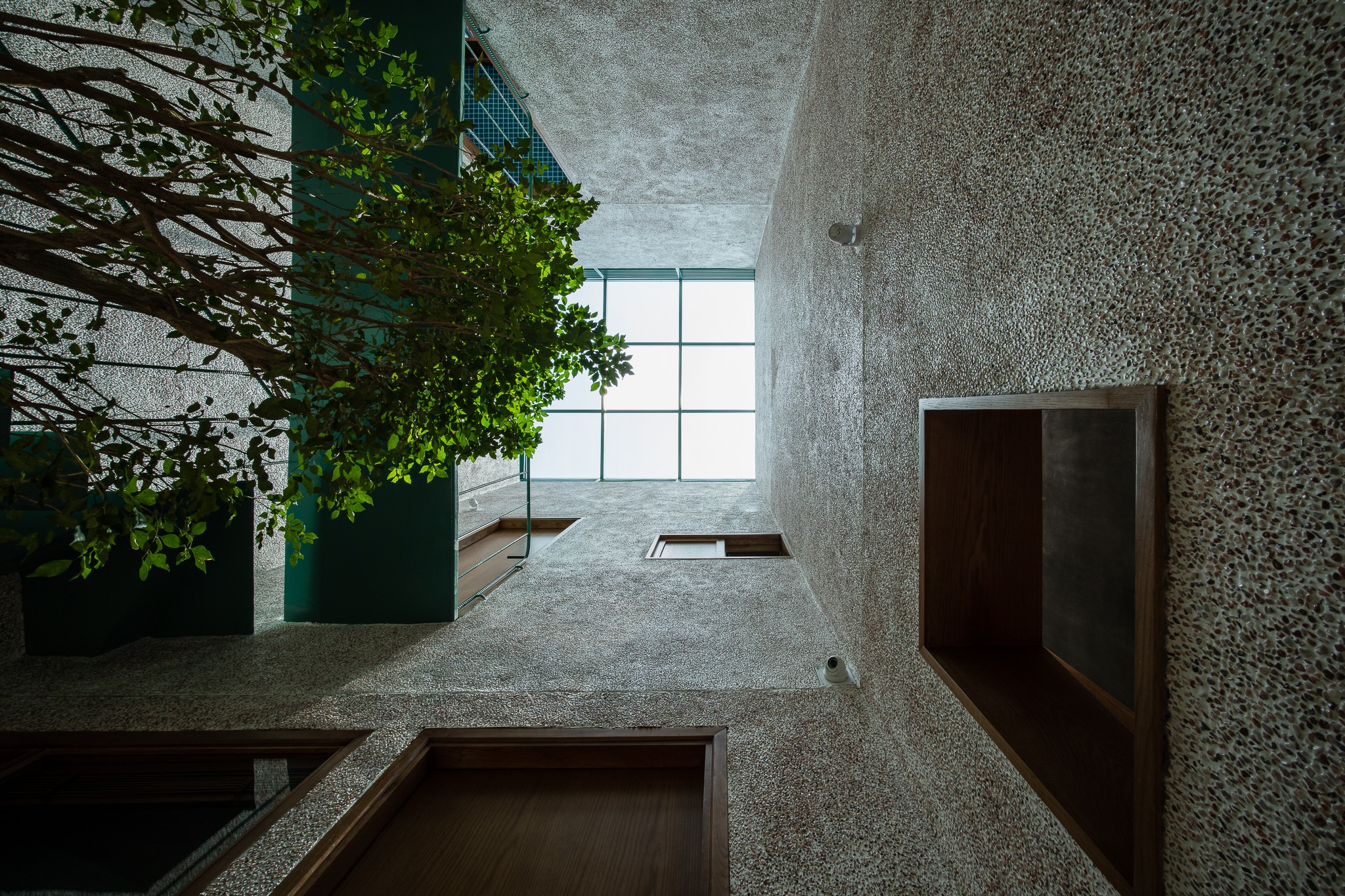 Tầng trệt là thiết kế “nhà giữa vườn” với kết cấu treo, bỏ cột ở góc. Sàn tầng trệt và sân vườn dùng bê tông xoa không ron, cửa được làm bằng kính để nối không gian bên trong và bên ngoài vườn.