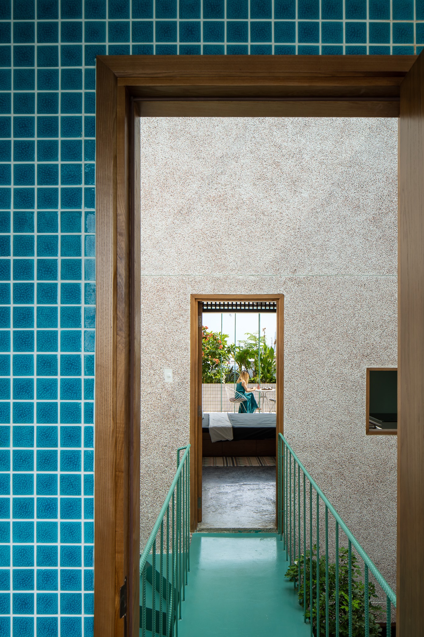 Cầu thang xanh xanh kết nối không gian phía trước và phòng tắm phía sau