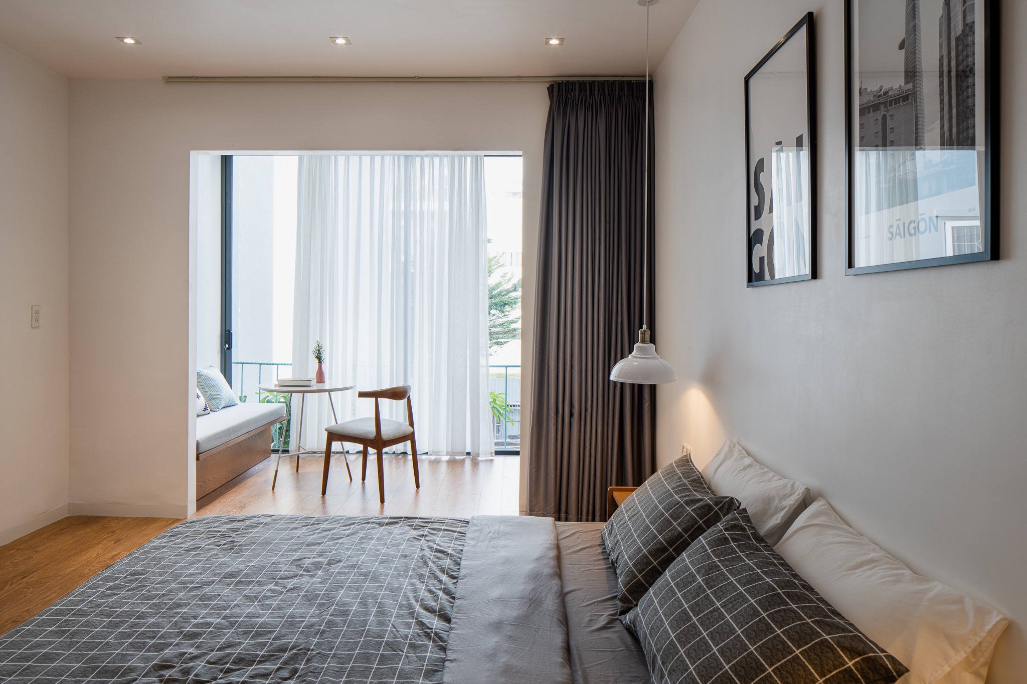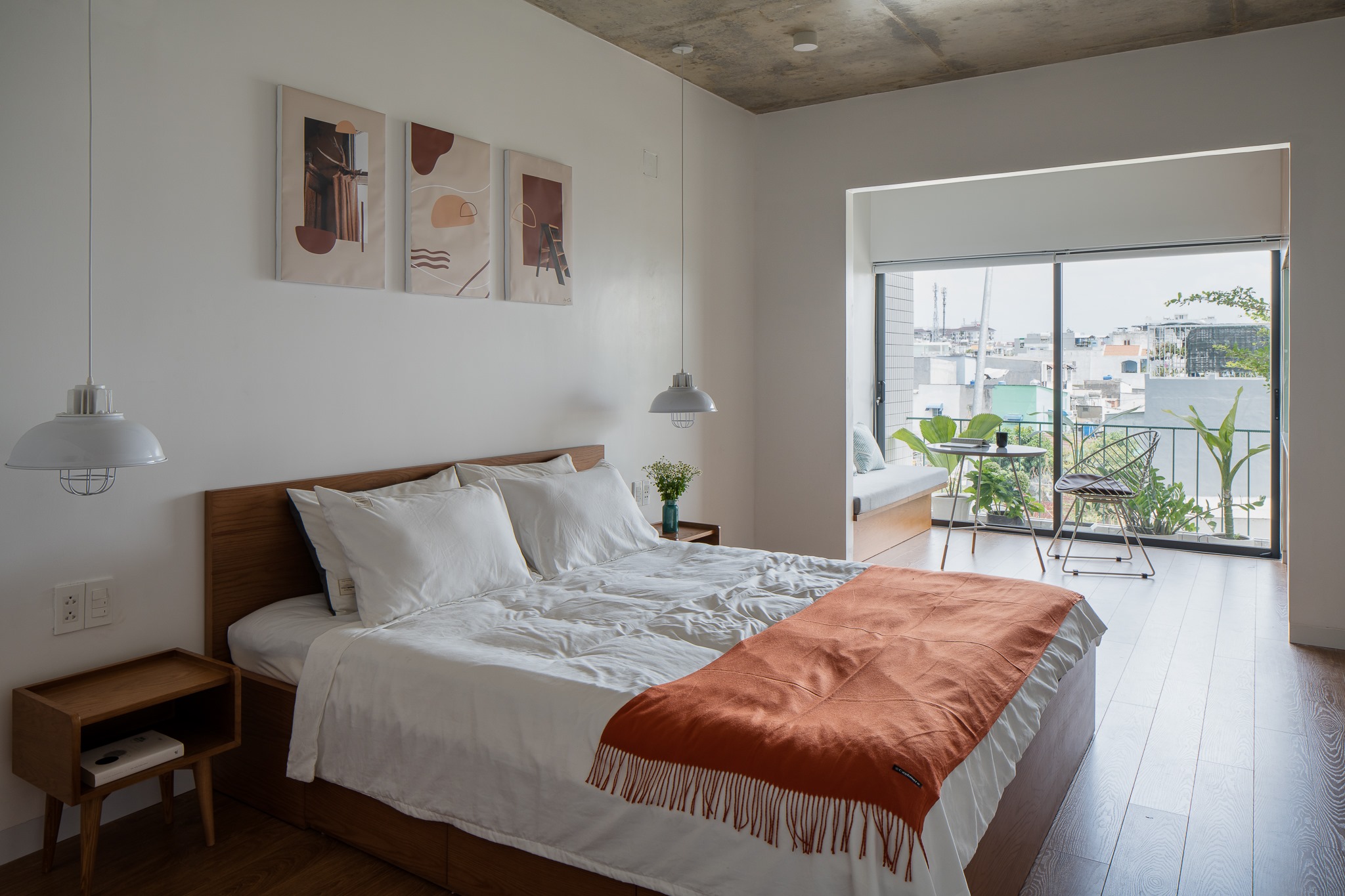 Phòng ngủ tầng một phong cách tối giản, được dành để cho thuê Airbnb.