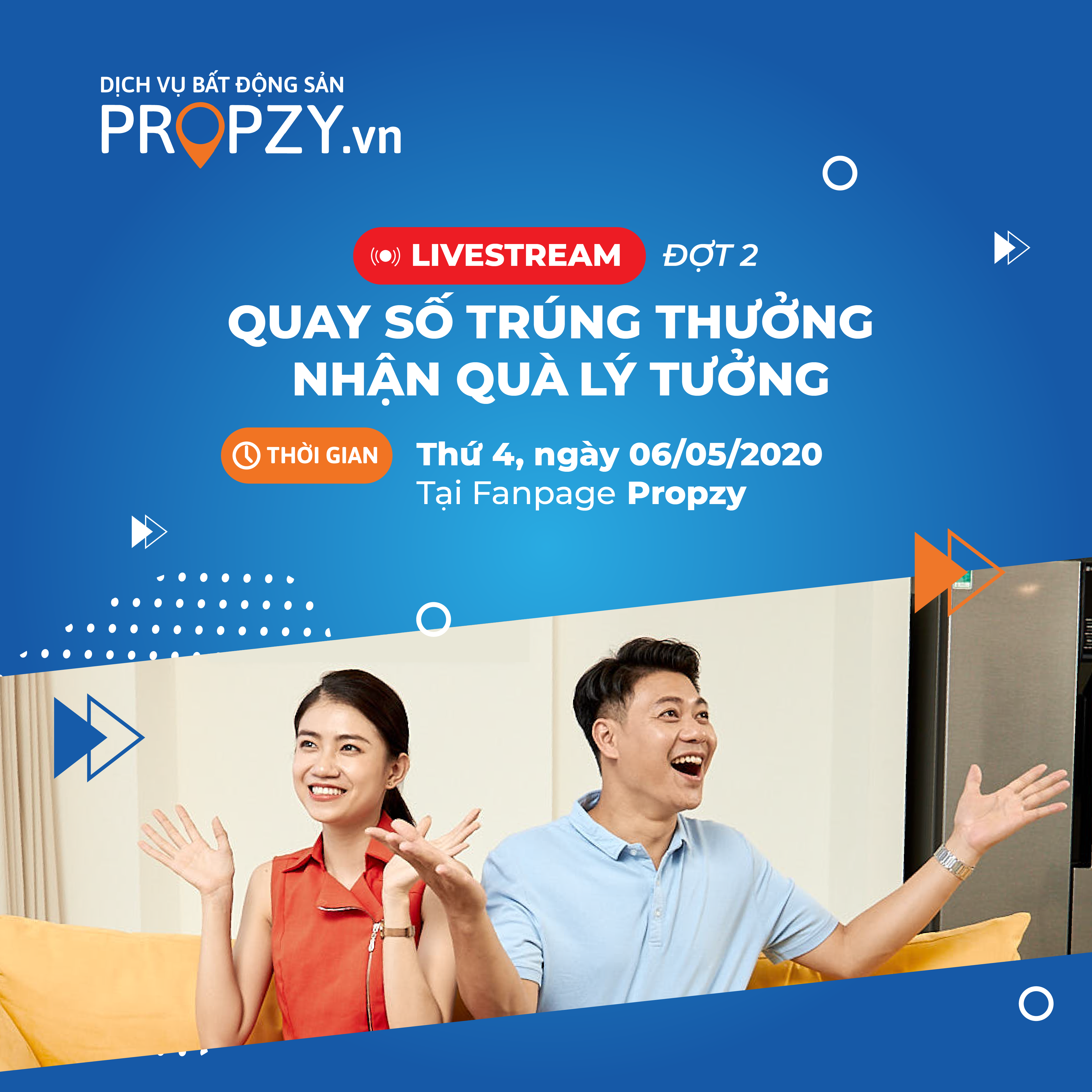 Tiếp nối thành công của sự kiện livestream đầu tiên, Propzy xin thông báo sẽ tiếp tục tổ chức buổi phát sóng trực tiếp “Quay số trúng thưởng – Nhận quà lý tưởng” đợt 2 vào lúc 20h ngày 6/5/2020.
