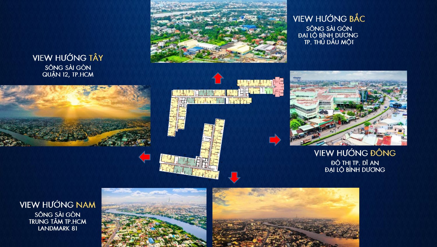 Hướng View: 75% là View sông sài Gòn, 25% View nội khu hoặc đại lộ sầm uất. Hướng nhìn thông thoáng, nhiều căn hướng Đông - Nam