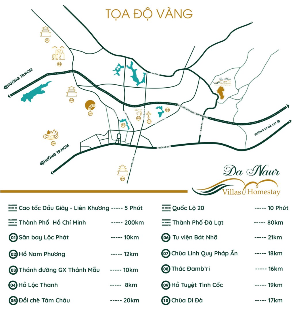 Điểm nhấn của dự án là có khả năng liên kết vùng mạnh mẽ khi được bao bọc bởi các tuyến đường huyết mạch: cao tốc Dầu Giây – Liên Khương, QL20, tỉnh lộ 725, sân bay Liên Khương,.. giúp cho cư dân tại Da Naur Villas & Homestay có thể dễ dàng di chuyển đến các trung tâm kinh tế lớn và các danh lam thắng cảnh nổi tiếng như Tp.HCM, Nha Trang, Phan Thiết, Phan Rang Tháp Chàm, các tỉnh Đông Nam Bộ, Nam Trung Bộ và Tây Nguyên,…