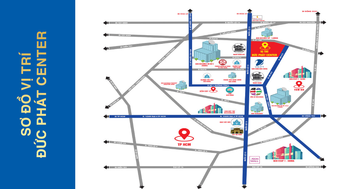 Trong tương lai nơi đây sẽ hình thành một hệ thống kết nối đồng bộ giữa các khu công nghiệp lớn trong tỉnh và vùng kinh tế trọng điểm phía Nam. Hạ tầng giao thông hoàn thiện sẽ là đòn bẩy giúp cho Đức Phát Center nói riêng và những dự án bất động sản trong khu vực đồng thời gia tăng giá trị.