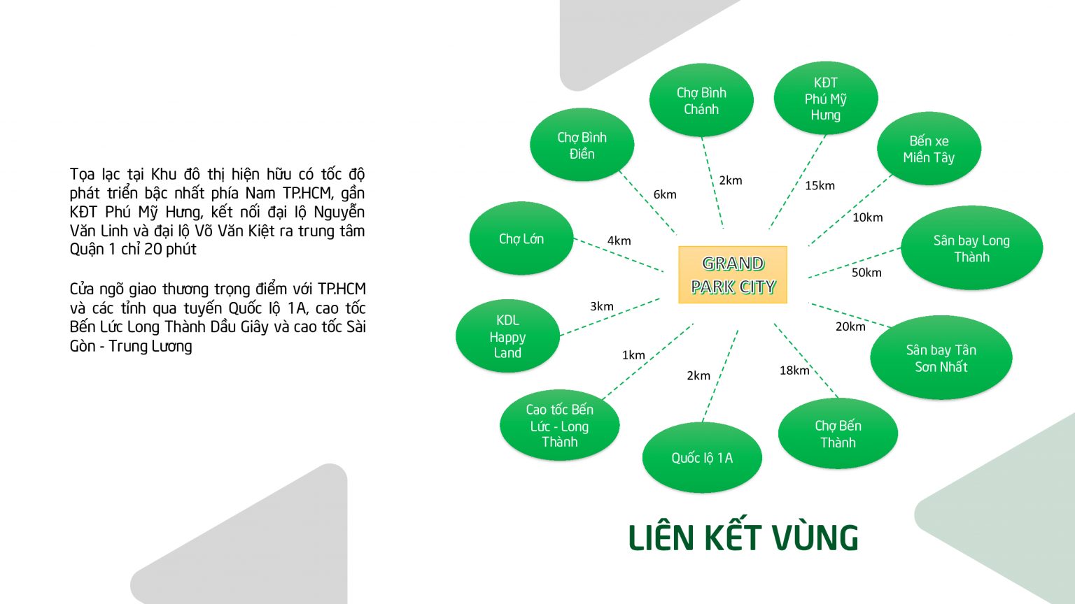 • 5 phút - 10 phút: Grand Park City > Cách Bến xe Rạch Kiến, Chợ Bình Chánh, UBND Huyện Bình Chánh, Cao tốc Bến Lức – Long Thành, Quốc lộ 1A, Đại lộ Nguyễn Văn Linh, KCN Vĩnh Lộc 2, Siêu thị Satra Foods, KCN Cầu Tràm, UBND Xã Phước Lý.