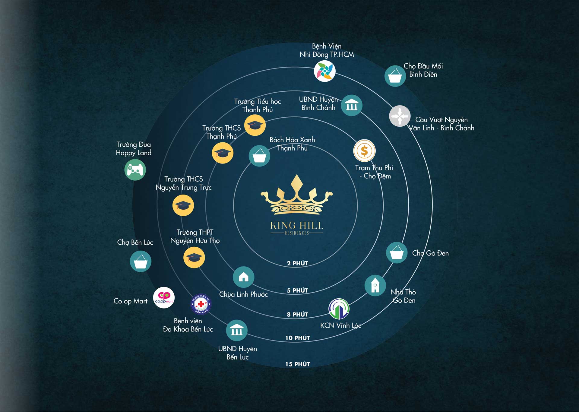 Bên cạnh các tiện ích nội khu đẳng cấp mà chủ đầu tư cung cấp, cư dân tại King Hill Residences còn có thể dễ dàng tiếp cận với các tiện ích ngoại khu hiện hữu. Tại đây cư dân có thể di chuyển thông qua tuyến đường Nguyễn Hữu Trí để đến bệnh viện Bình Chánh hoặc cũng có thể đến vòng xoay An Lạc để đi Tp. HCM một cách dễ dàng.