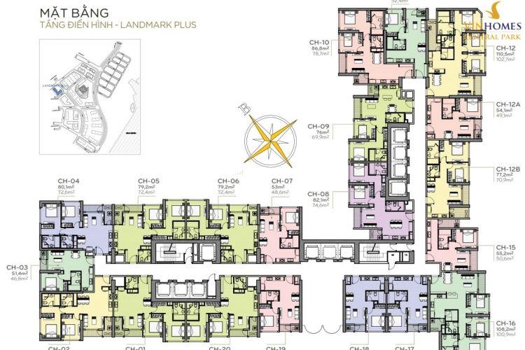 Khu căn hộ Landmark Plus gồm 50 tầng với số lượng 20 căn/sàn. Diện tích mỗi căn hộ dao động từ 54 – 110m2 với 1 – 3 phòng ngủ ) thuộc loại hình căn hộ dịch vụ.