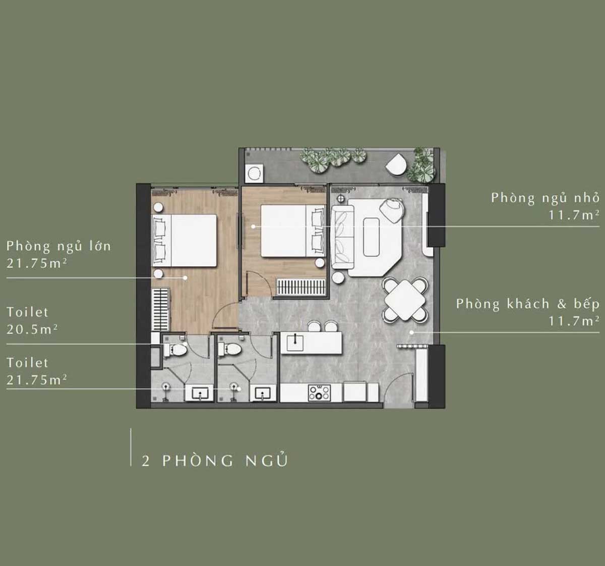 • Diện tích Căn hộ 2 PN: 73.80m2 – 74.62m2 – 75.85m2;