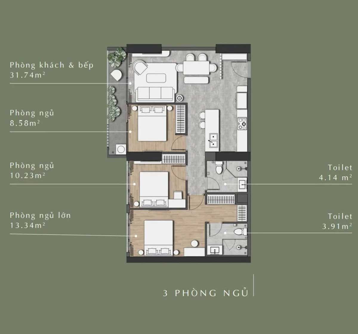 • Diện tích Căn hộ 3 PN: 93.18m2 – 99.78m2.