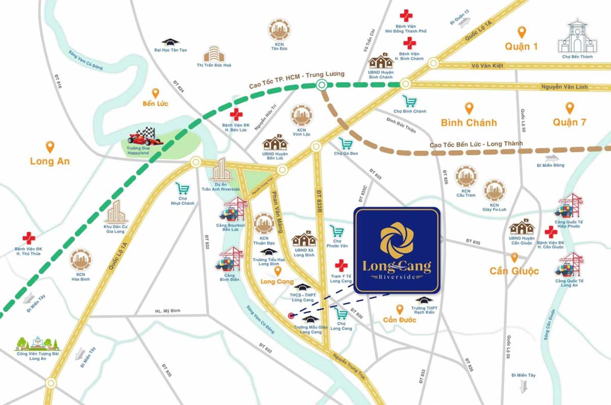 Vị trí dự án Long Cang Residence tọa lạc tại mặt tiền đường đại lộ Nguyễn Trung Trực, Thuộc Xã Long Cang, Huyện Cần Đước, Tỉnh Long An.