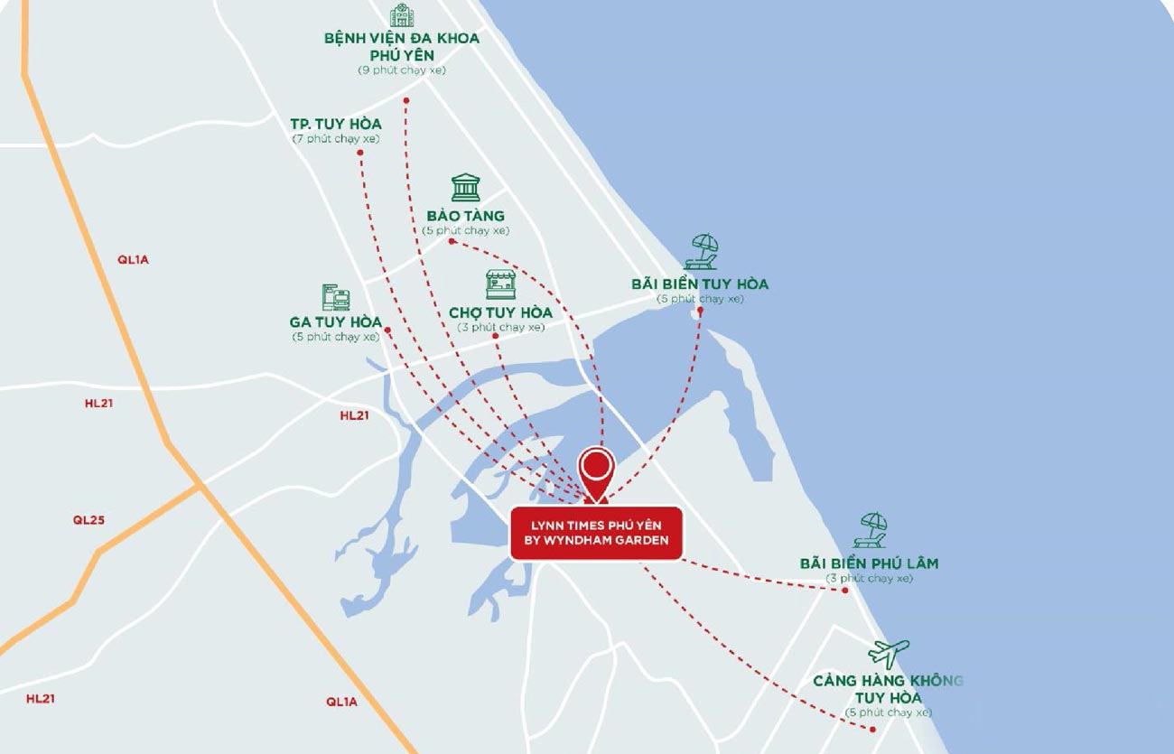 Vị trí dự án Lynn Times Phú Yên tọa lạc ngay mặt tiền đại lộ Phan Chu Trinh, phường Phú Đông, thành phố Tuy Hòa, tỉnh Phú Yên, nằm kế bên sông Đà Rằng rất thuận lợi di chuyển đến các khu vực lân cận như.