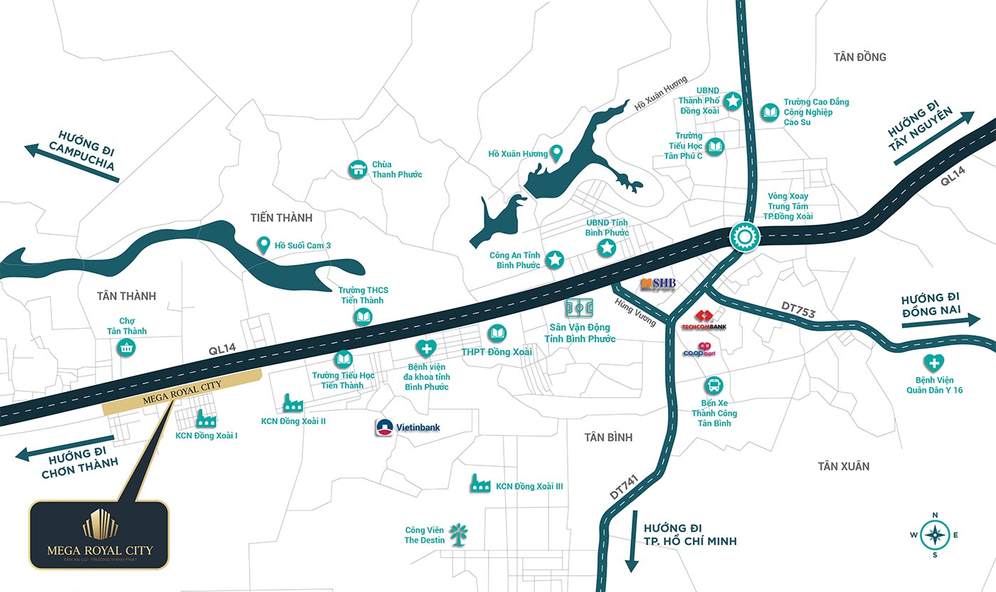 Điếm nhấn vị trí Mega Royal City tọa lạc tại giao lộ ” Vàng” tại con đường huyết mạch QL14, xã Tân Thành, Thành phố Đồng Xoài, tỉnh Bình Phước. Là tâm điểm kết nối giao thương giữa các tỉnh Đông Nam Bộ, Tây Nguyên và nước bạn Campuchia. Từ đây, dễ dàng di chuyển đến TP. HCM, Bình Dương, Đồng Nai, TP. Đồng Xoài, Tây Ninh,…với mạng lưới giao thông đồng bộ và hiện đại.