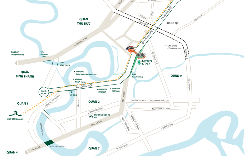 Tại vị trí này, dự án Metro Star giao với đường Vành Đai 2, nơi kết nối với đường Phạm Văn Đồng – Mai Chí Thọ – Cao tốc Long Thành – Dầu Giây – Đại lộ Võ Văn Kiệt đi về các tỉnh miền Tây.