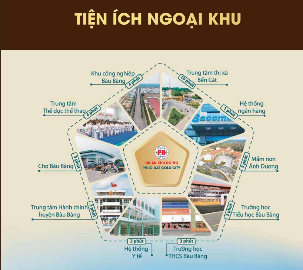 Tiện ích ngoại khu: Nằm tại trung tâm thị trấn Lai Uyên, khu đô thị Phúc Đạt Gold City sở hữu nhiều tiện ích ngoại khu hiện hữu, có thể kể đến như trường học các cấp, ngân hàng, trung tâm hành chính, trung tâm thể dục thể thao, chợ Bàu Bàng và bệnh viện…