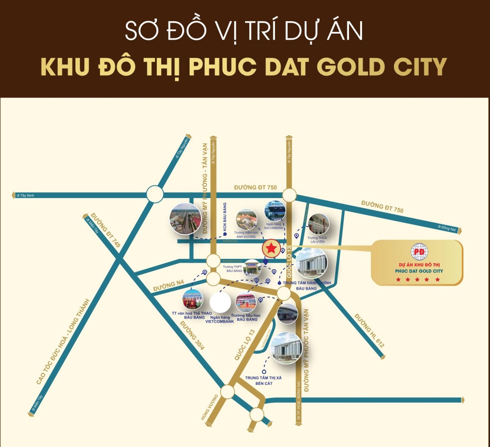 Phúc Đạt Gold City tọa lạc tại trung tâm Thị trấn Lai Uyên, huyện Bàu Bàng, tỉnh Bình Dương. Vị trí này được giới chuyên gia đánh giá là vô cùng tiềm năng bởi dự án sở hữu quỹ đất cuối cùng tại Khu công nghiệp - Đô thị Bàu Bàng, sát cạnh Quốc lộ 13 - Trung tâm hành chính Bàu Bàng - Bệnh viện Bàu Bàng và gần nhiều khu công nghiệp lớn như Lai Hưng, Cây Trường, Chơn Thành, Mỹ Phước III...
