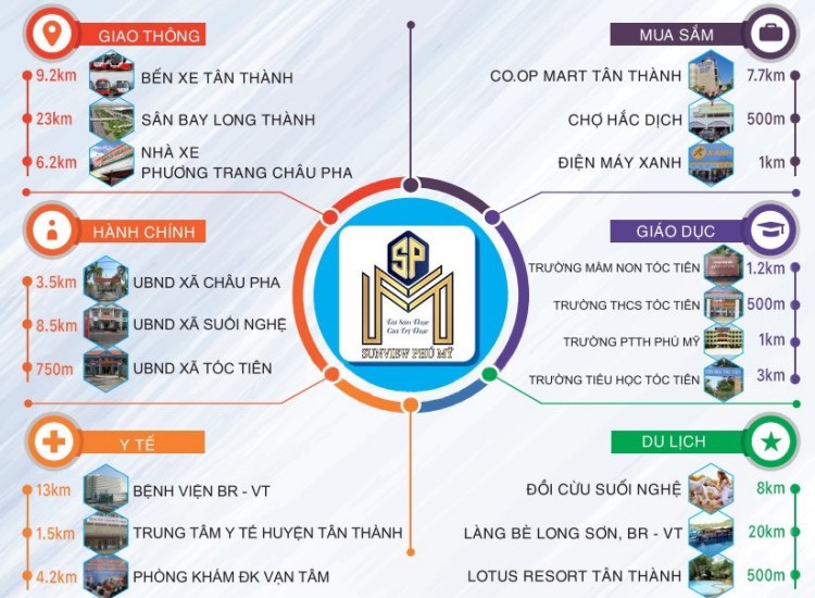 Vị trí dự án Sunview Phú Mỹ ngay trung tâm thị xã Phú Mỹ. Từ đây, cư dân kết nối nhanh đến chợ Tóc Tiên, trường THPT Hạch Dịch, chợ Tóc Tiên chỉ 3 - 5 phút di chuyển. Đặc biệt dự án liền kế tuyến cao tốc Biên Hòa - Vũng Tàu, các vòng xoay Ngã Giao khoảng 1km, đường Mỹ Xuân - Ngã Giao 300 mét.