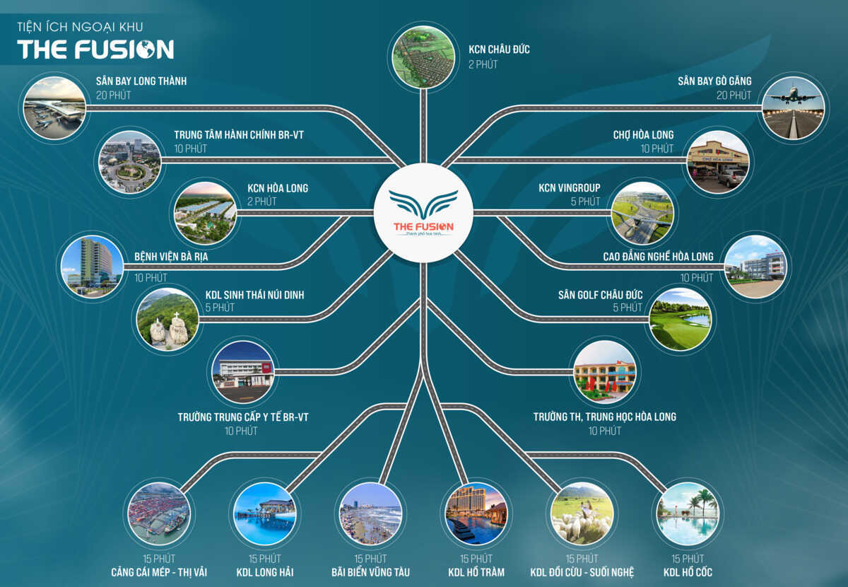 Do vị trí của The Fusion nằm tại khu vực trung tâm, nên cư dân của dự án dễ dàng tiếp cận những tiện ích hiện đại như Sân bay Long Thành, Cụm Khu công nghiệp Sonadezi, Khu công nghiệp Hòa Long, Long Hương 2, trung tâm hành chính, trung tâm thương mại, UBND xã Nghĩa Thành, TP Vũng Tàu, TP Bà Rịa, UBND huyện Châu Đức, Công viên Hòa Bình, Coop Mart, trường học viện Anh Quốc, trường mầm non Phước Hiệp, Trường ĐH – CĐ Dầu Khí, CĐ Sư phạm Bà Rịa, Bệnh viện Đa khoa...
