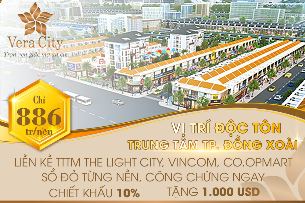 Vera City là dự án đất nền đã có sổ đỏ được quy hoạch trên quỹ đất vàng 3,3ha, cung ứng ra thị trường hơn 500 nền nhà phố thương mại, toạ lạc dự án đắc địa ngay Quốc lộ 14, giữa hai KCN Đồng Xoài 1, Đồng Xoài 2, đồng thời liền kề trung tâm thương mại The Light City.