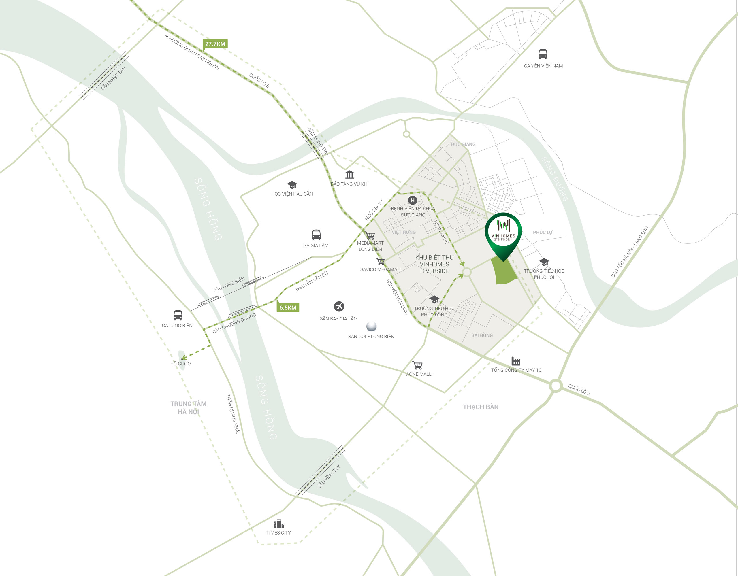 Khu căn hộ Vinhomes Symphony tọa lạc tại giao lộ 2 đường Chu Huy Mân và Hội Xá, quận Long Biên, Hà Nội. Vị trí này giúp cư dân dễ dàng di chuyển đến nhiều khu vực lân cận như Bắc Ninh, Bắc Giang, Hưng Yên, Hải Phòng,.. thông qua các tuyến đường trọng điểm như Chu Huy Mân, Ngô Gia Tự, Nguyễn Văn Linh, Đoàn Khuê,...