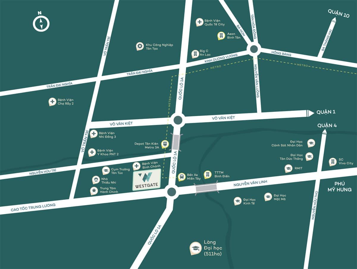 Với vị trí này, West Gate không chỉ mang đến cho khách hàng và các nhà đầu tư cơ hội sinh lời lý tưởng mà còn là nơi An cư lập nghiệp với vị trí đắt địa, không khí trong lành với 2 công viên rộng lớn trong và ngoài dự án.
