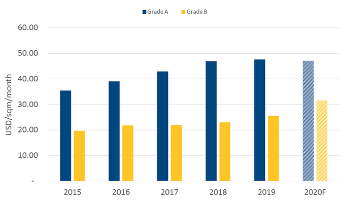 Báo cáo Thị trường văn phòng TP HCM quý III/2020 của Colliers International Vietnam cho biết, giá chào thuê trung bình văn phòng hạng A và B quý III đều tăng lần lượt 4,5% và 11,5% so với quý II.