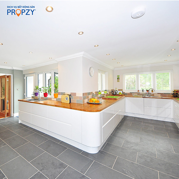 Để tránh tạo cảm giác chật chội cho bếp, bạn nên tối giản trong trang trí cũng như bày biện đồ vật như lựa chọn tủ bếp với bề mặt trơn chẳng hạn. Tuy nhiên với sàn bếp, bạn hãy sử dụng gạch lát kích thước lớn và cùng tông màu với tường và tủ bếp để bếp trông rộng rãi hơn.