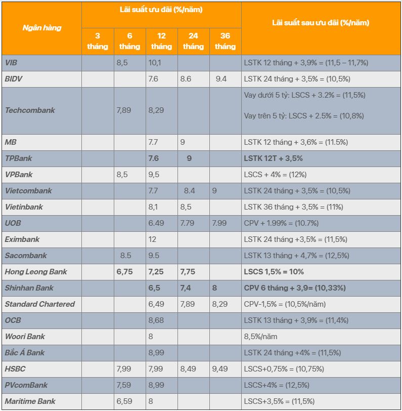 Hết thời gian ưu đãi, lãi suất cho vay trung bình ở mức 10,1%/năm và thời hạn vay kéo dài 20 năm. Tại Vietcombank, lãi suất cũng được giảm từ 8,1%/năm xuống 7,7%/năm với gói vay ưu đãi 12 tháng. Đặc biệt, để đa dạng hóa lựa chọn Vietcombank cũng cung cấp ra thị trường 7 phương án chọn ưu đãi lãi suất để người mua nhà có thể chủ động trong việc tính toán kế hoạch vay vốn.