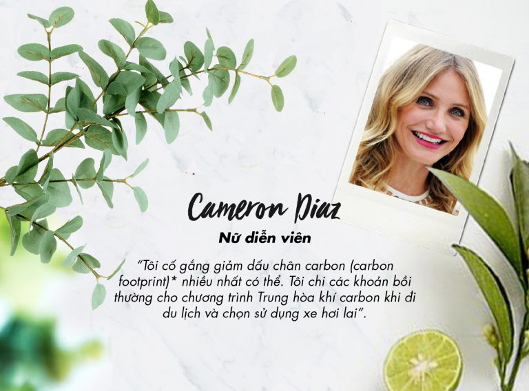 “Phương pháp bảo vệ môi trường của tôi chính là cố gắng giảm dấu chân carbon (carbon footprint)* nhiều nhất có thể. Tôi chi các khoản bồi thường cho chương trình Trung hòa khí carbon khi đi du lịch và chọn sử dụng xe hơi lai”.