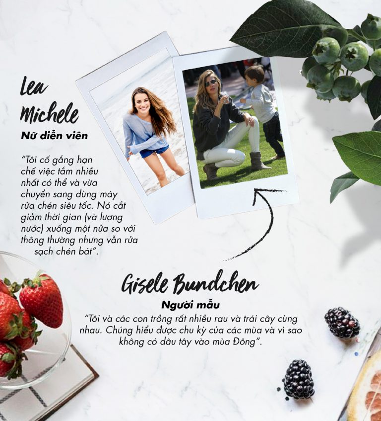 “Tôi cố gắng hạn chế việc tắm nhiều nhất có thể và vừa chuyển sang dùng máy rửa chén siêu tốc để bảo vệ môi trường. Nó cắt giảm thời gian (và lượng nước) xuống một nửa so với thông thường nhưng vẫn rửa sạch chén bát”.