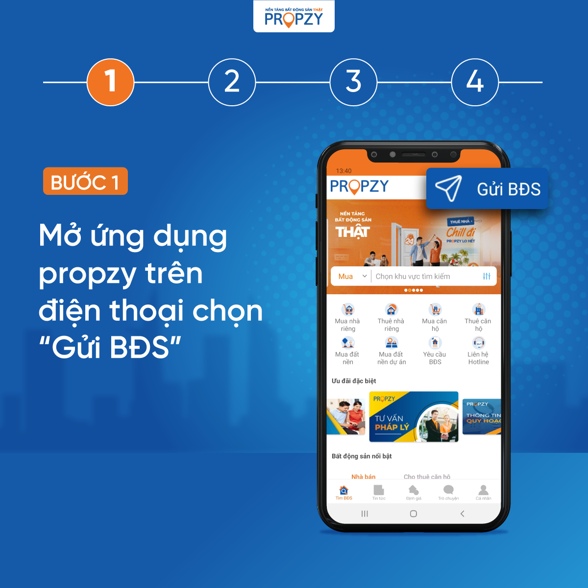 BƯỚC 1: MỞ ỨNG DỤNG PROPZY TRÊN ĐIỆN THOẠI, CHỌN GỬI BĐS