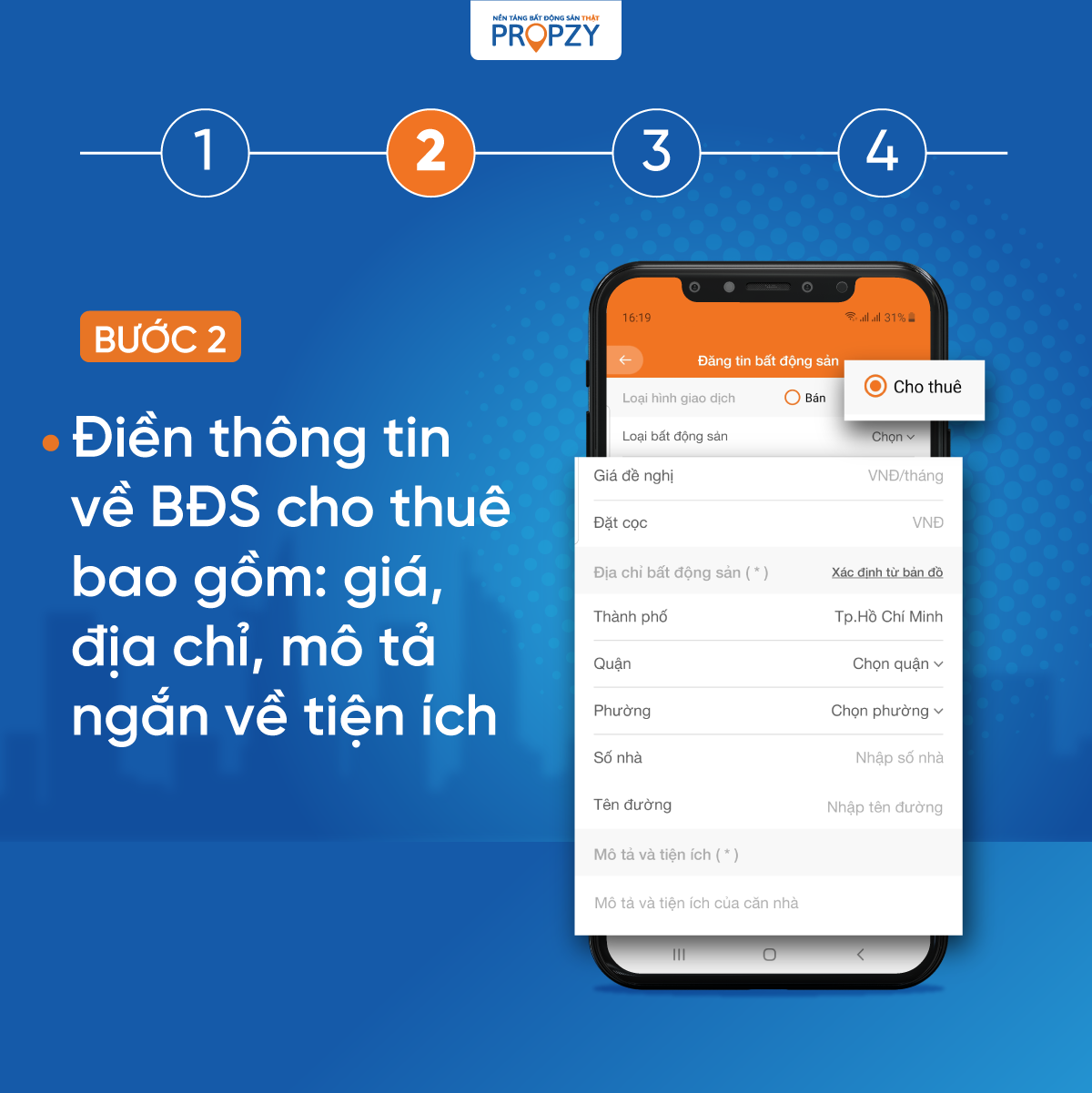 BƯỚC 2: ĐIỀN THÔNG TIN VỀ BĐS CHOTHUÊ GỒM GIÁ, ĐỊA CHỈ, MÔ TẢ NGẮN VỀ TIỆN ÍCH