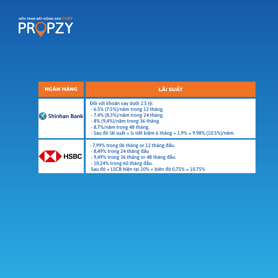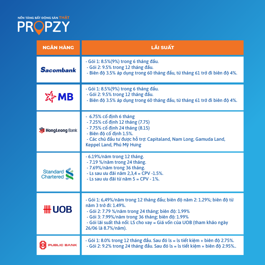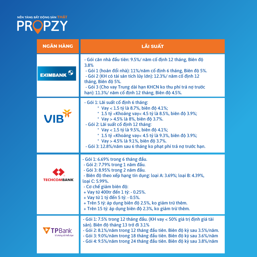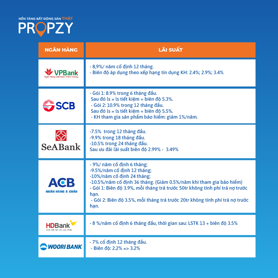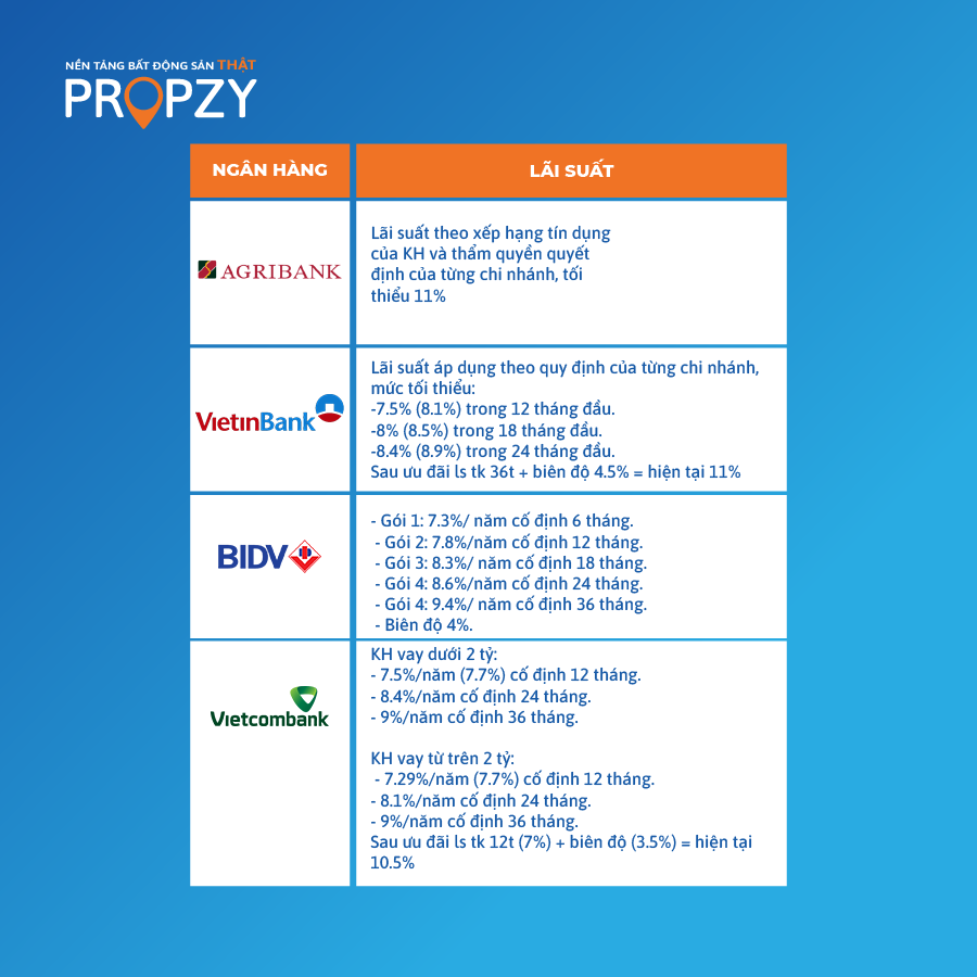 Dưới đây là bảng lãi suất vay ngân hàng mua nhà được Propzy cập nhật.