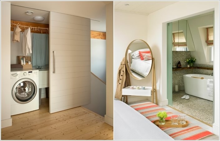Trong không gian nhỏ, bạn phải bỏ bớt nội thất hoặc vật trang trí để thiết kế cửa. Thay vào đó bạn hãy sử dụng cửa trượt thay thế cho cánh cửa đóng mở thông thường và bạn sẽ cảm nhận được sự khác biệt trong không gian lớn hơn.