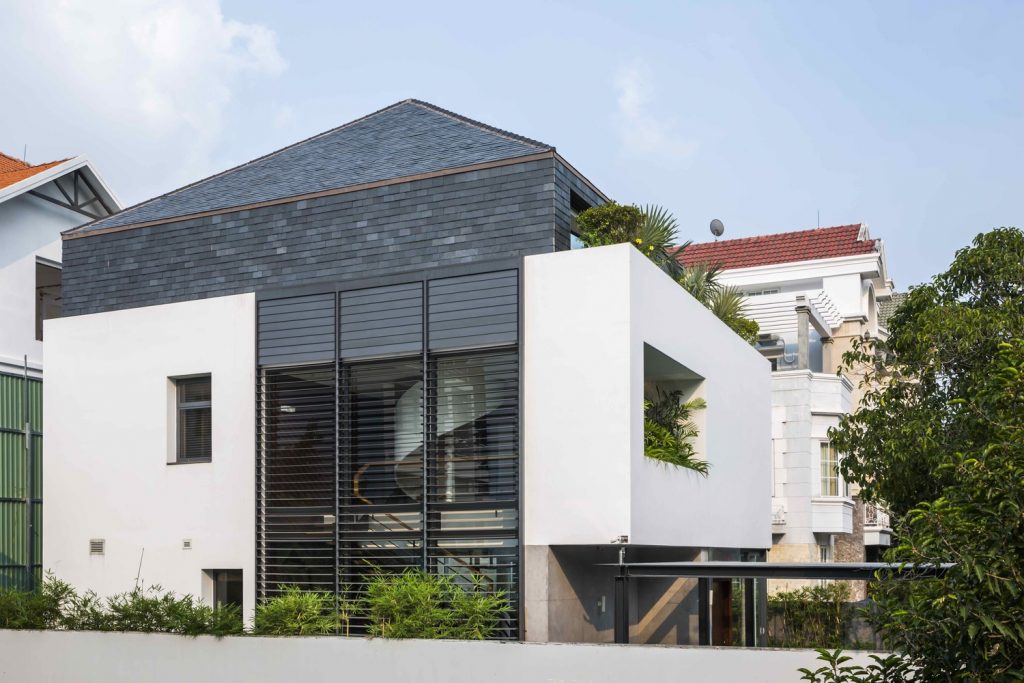 Với mặt trời hướng về phía tây của ngôi nhà, khí hậu nhiệt đới của Sài Gòn và môi trường xung quanh, các kiến trúc sư đã thiết kế mái dốc, độ cao và màu sắc của bức tường giúp hạn chế ánh nắng trực tiếp, trồng cây xanh xung quanh làm mát cho ngôi nhà.