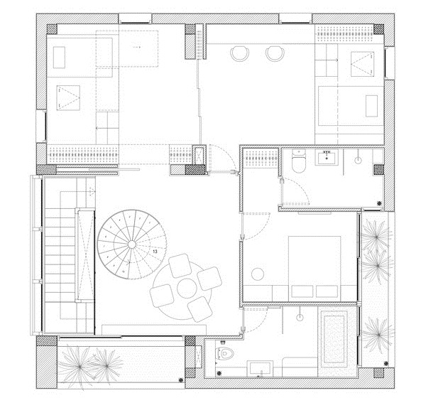 Ngược lại với tầng trệt, đó là một khối rắn với tường gạch dày gấp đôi giữ cho ngôi nhà mát mẻ và điều hòa không khí hiệu quả hơn.