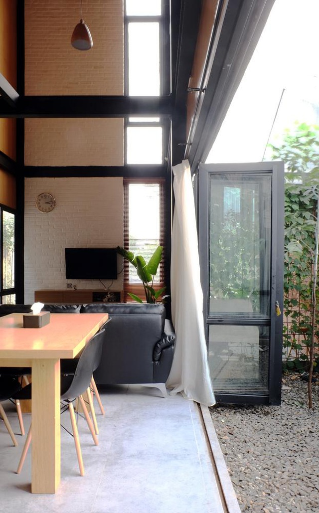Khoảng mở lớn kết nối với một khu vườn nhỏ ở bên cạnh nhà cũng góp phần đem ánh sáng và không khí thoáng mát vào bên trong nhà.
