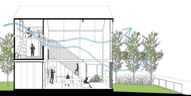 Các kiến trúc sư sử dụng giải pháp lấy sáng tự nhiên và thông gió chéo. Họ tận dụng mặt sau là cánh đồng thông thoáng để tạo ra những khoảng mở ở cả hai mặt trước – sau giúp luồng không khí dễ dàng lưu thông.