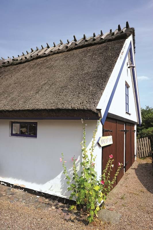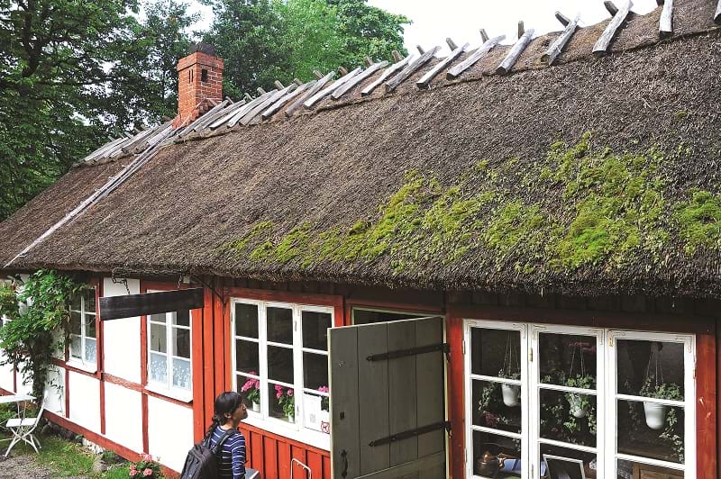 Nhà mái rạ Thuỵ Điển với dốc mái đứng đặc trưng ở Bắc Âu.