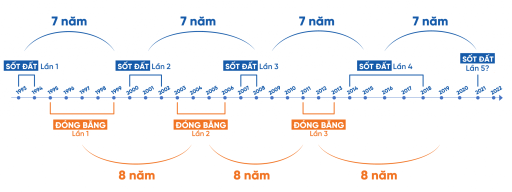Biểu đồ trên cho thấy, tính từ năm 1993, thị trường bất động sản Việt Nam trải qua 4 đợt “sốt đất” và 3 đợt “đóng băng”. Gần đây nhất, vào quý 1/2021, có hiện tượng sốt đất nhẹ. Tuy nhiên, giữa năm 2021, thị trường bất động sản giai đoạn đóng băng, bởi ảnh hưởng của Covid-19 (giai đoạn áp dụng quy định giãn cách thành phố).